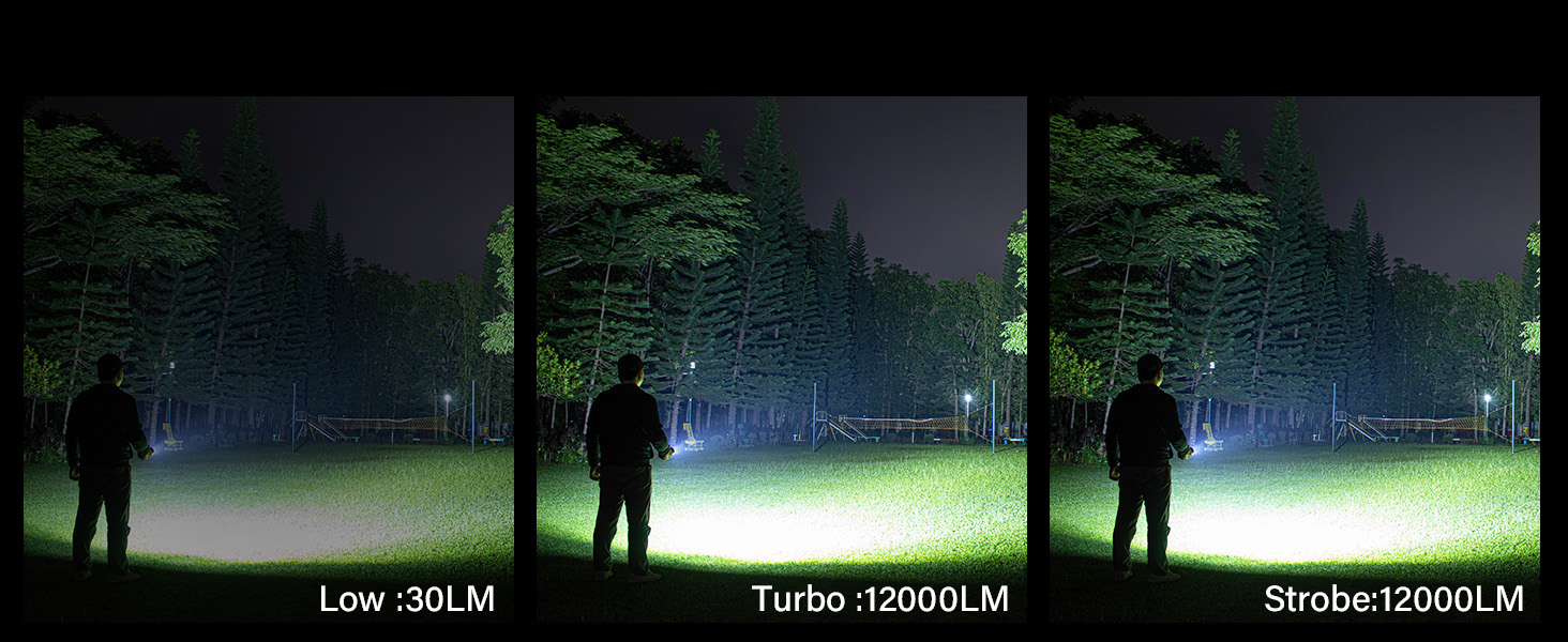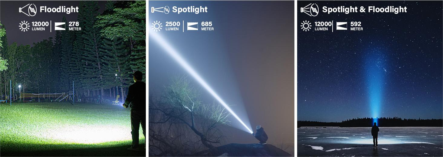 12000 lumenów Ultrajasność: Wyposażona w 1 diodę SFT40 + 12 diod LED TN-3535, zapewniając zasięg wiązki do 685 metrów.